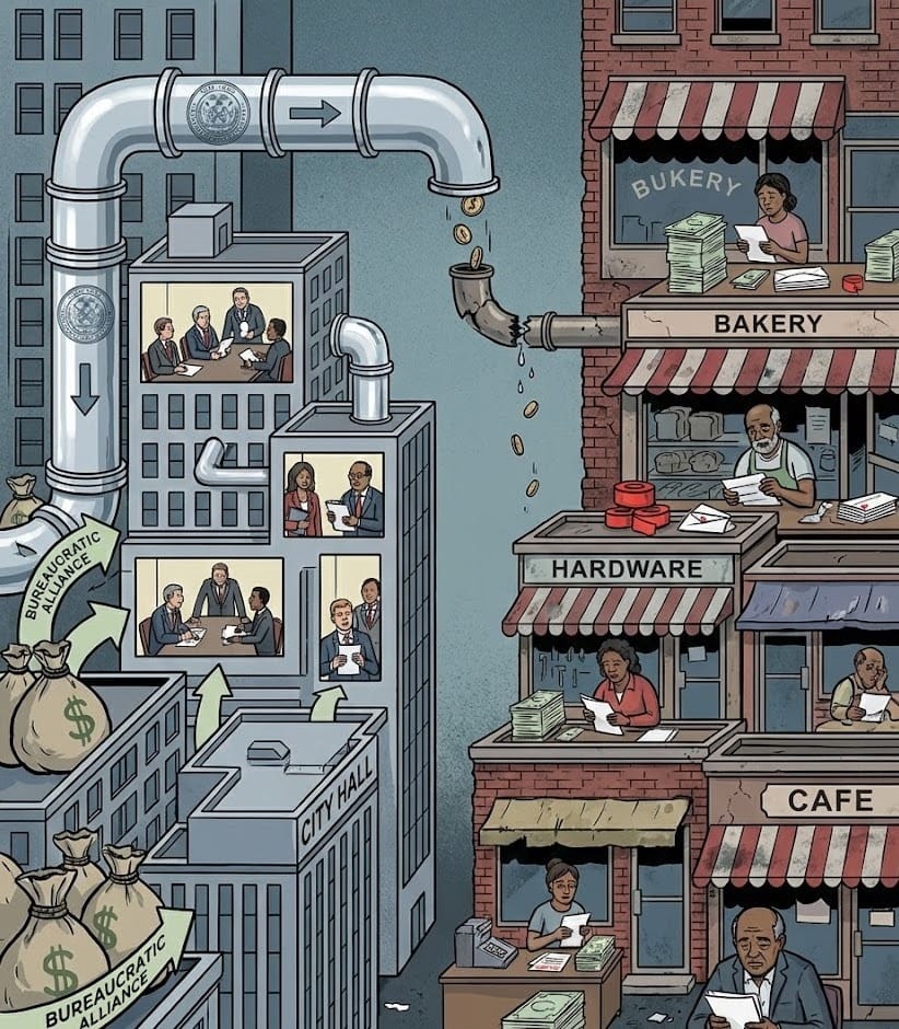 Small businesses are inspected, fined, delayed, and regulated by multiple agencies that don’t coordinate with each other. Permits arrive late. Inspections overlap. Rules contradict. Fees compound. Time burns. Owners adapt or close. When a business shuts down, the city loses sales tax, employment, foot traffic, neighborhood safety, and cultural gravity.